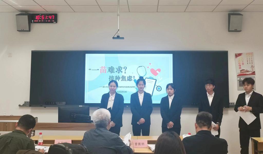 第二会场共有九支队伍进入此次答辩环节,他们围绕“HPV疫苗”“金华市红色旅游开发现状与策略分析”“旅游参与现状及满意度”等社会热点展开调研,他们将理论知识与民生民意相融,将调查结果应用到生活中。