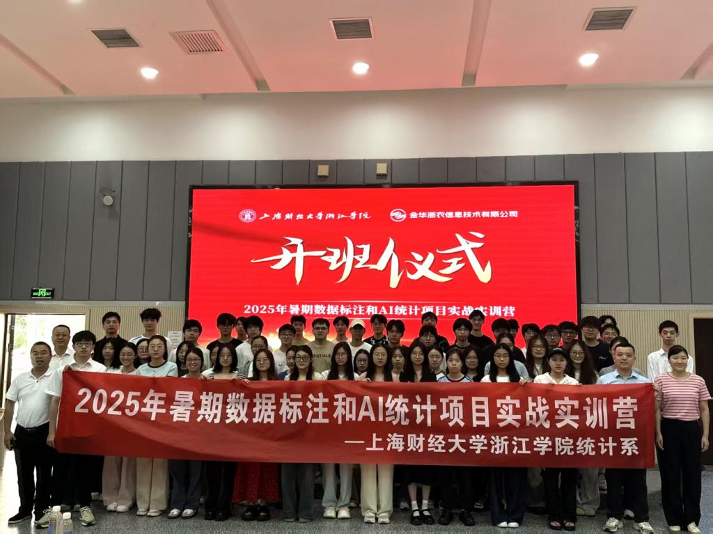 近日,爱体育在线联合金华浙农信息技术有限公司,共同举办2025年暑期数据标注和AI统计项目实战实训营。金华浙农信息技术有限公司总经理郑永富及相关技术骨干,统计系负责人武斌及相关教师,以及全体参训学生共同出席开营典礼。